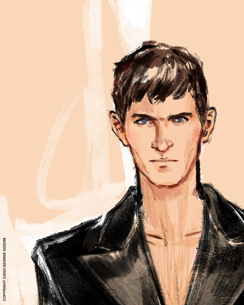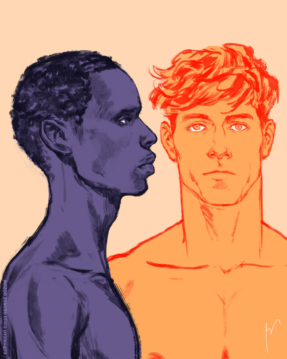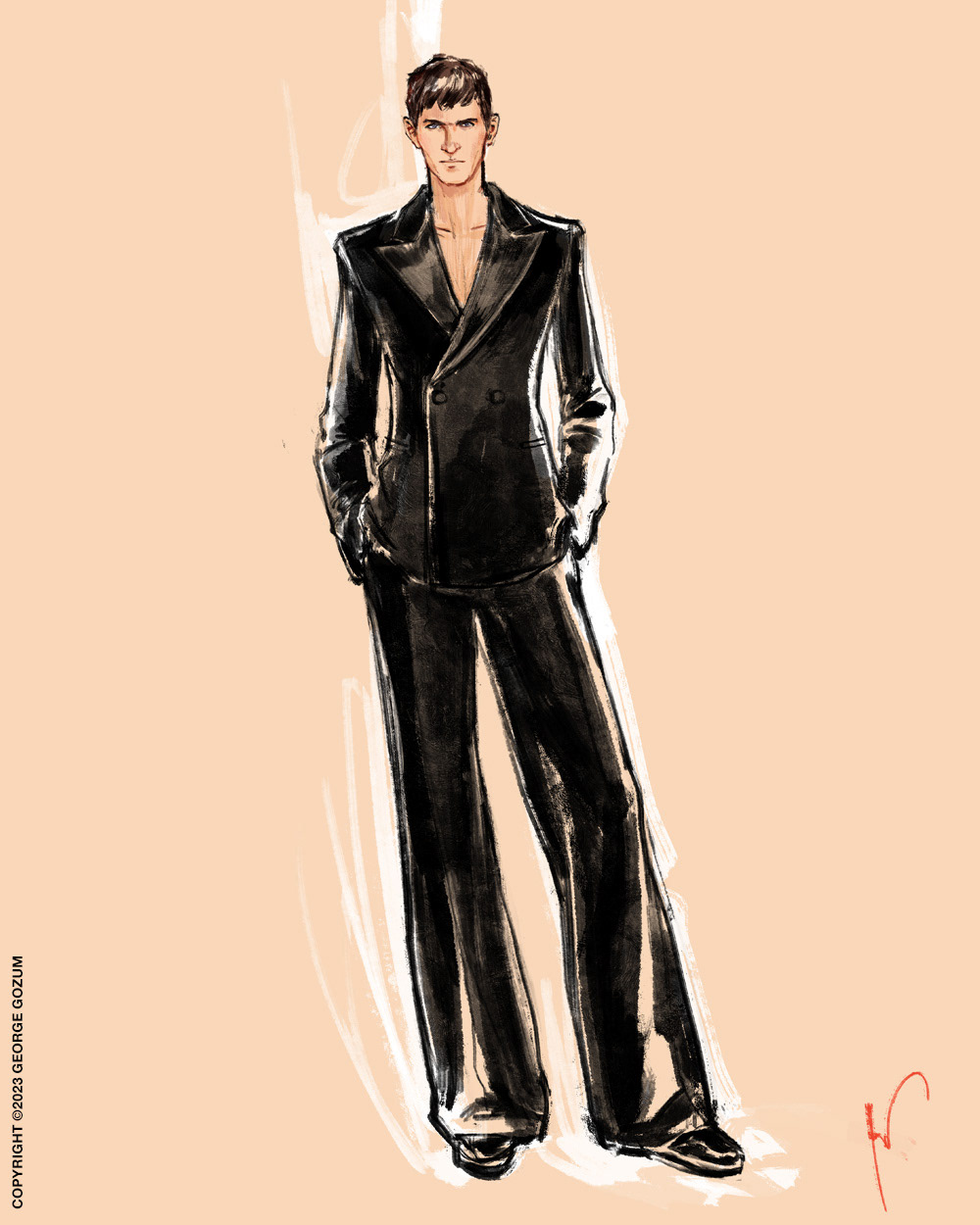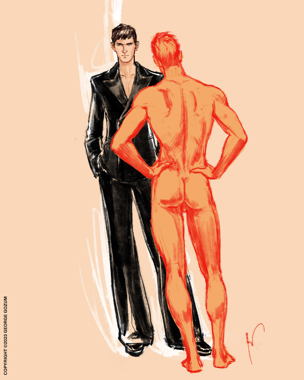 Fashion illustrations in a menswear editorial featuring clothed and nude figures.