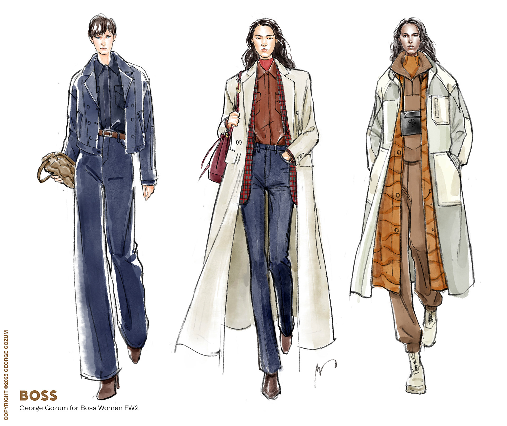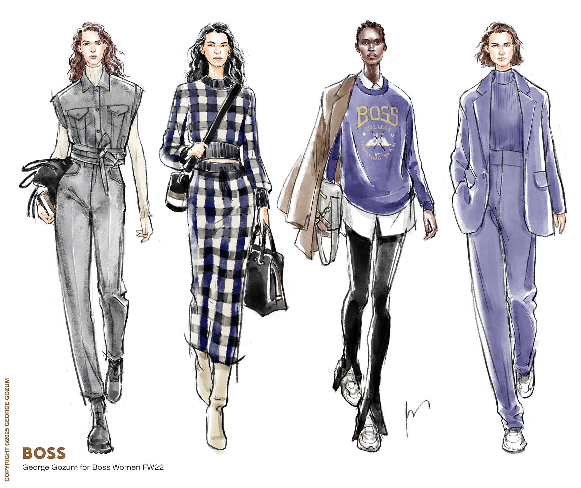 Fashion illustrations for Hugo Boss Women Fall Winter 2022.