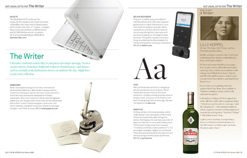 Kate's Paperie in New York is famous for its unique gift wrapping. Our mandate was to produce a holiday gift guide that was equally creative in both looks and content, to enhance Kate's Paperie's image as not just a place for excellent gift wrapping, but also as an expert on the gifts inside. The cover design plays off the the title "Unwrapped" with layered, uneven sheets that only partially covered the booklet. The content broke the gift categories according to personalities, complete with mini interviews from celebrities who fit that personality type, giving their take on the best gifts they've both wanted and have received.