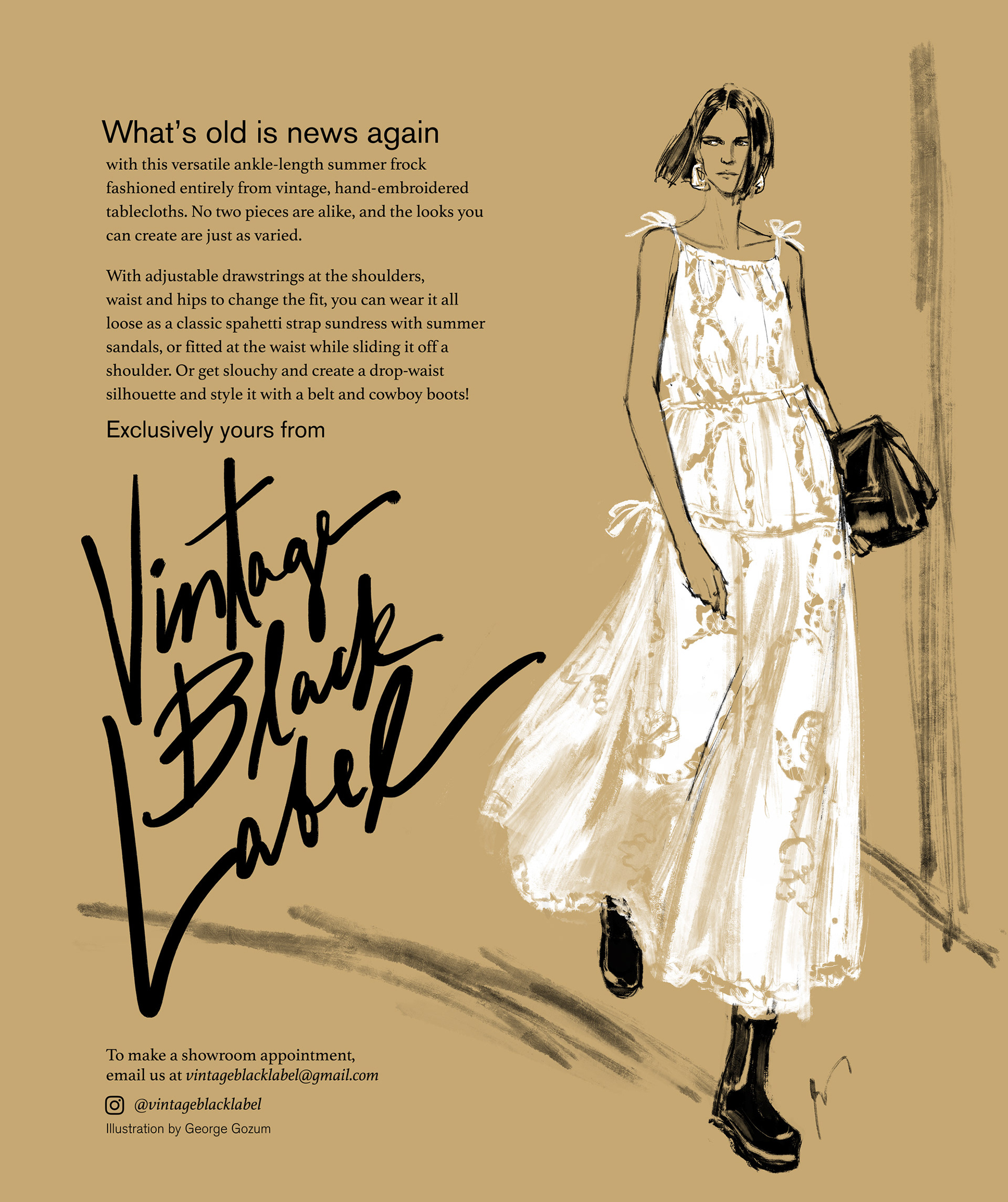 Vintage Black Label is a vintage designer clothing resale label that sometimes also designs and produces new clothing with a vintage spin. I was asked me to illustrate their new line of 'mantel' summer dresses: shifts made from recycled vintage tablecloths, or 'mantel' in Tagalog. Since the brand's focus is vintage clothing, I thought it would be fun to evoke old Lord & Taylor advertising for this series, from the layout to the copy, as well as my own humble homage to the great L&T illustrator, Fred Greenhill.